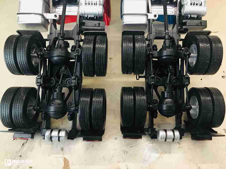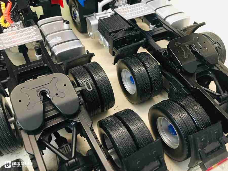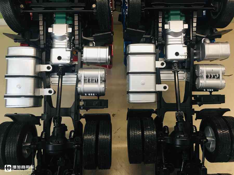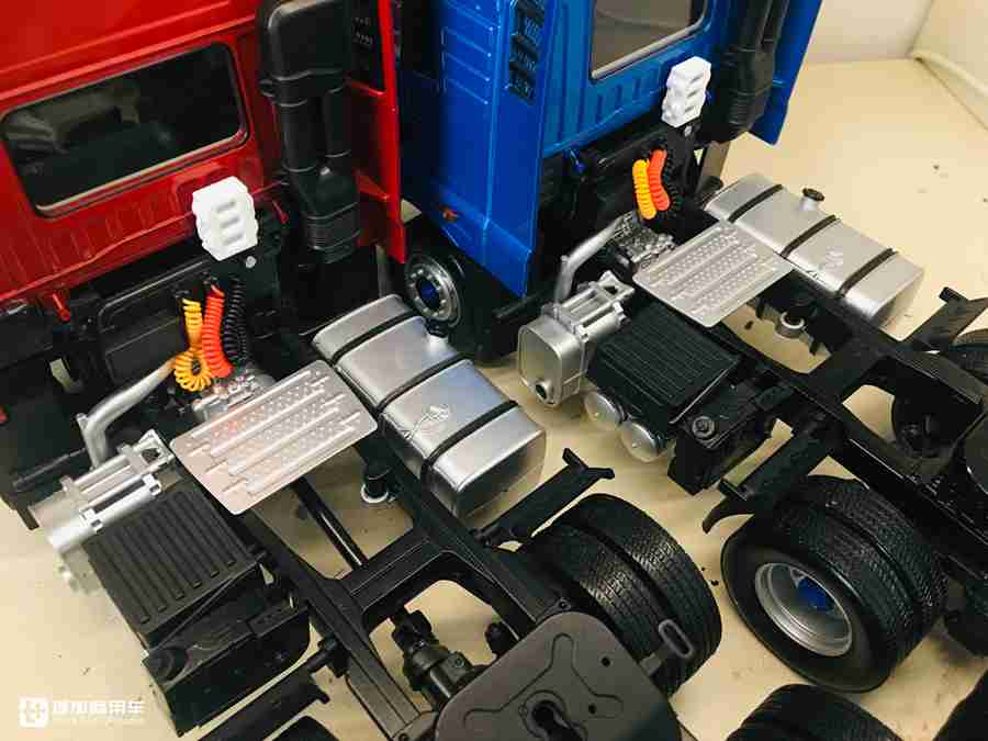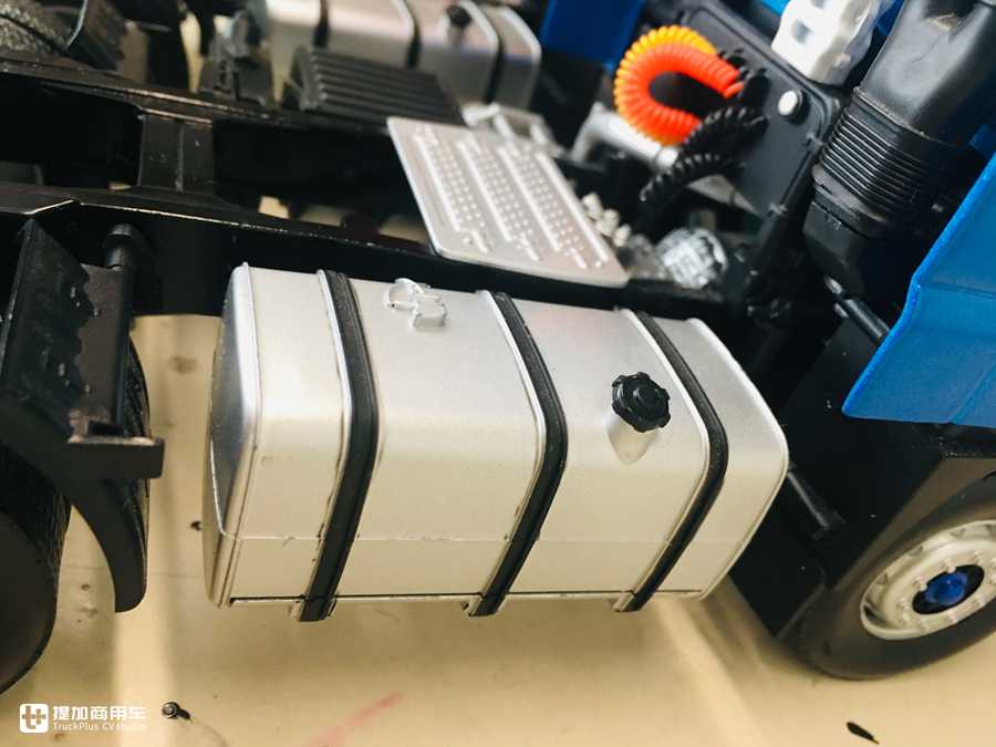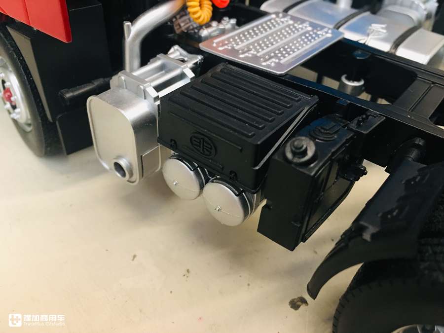 而其余部分,一二版模型并没有过大的区别,底盘上的配置也基本一致,挡泥板也是使用较为经济的分体式结构,但挡泥板支柱的结实程度一般,比较容易出现损坏。在后方还可以看见大梁末端的这个硕大的储气罐结构。