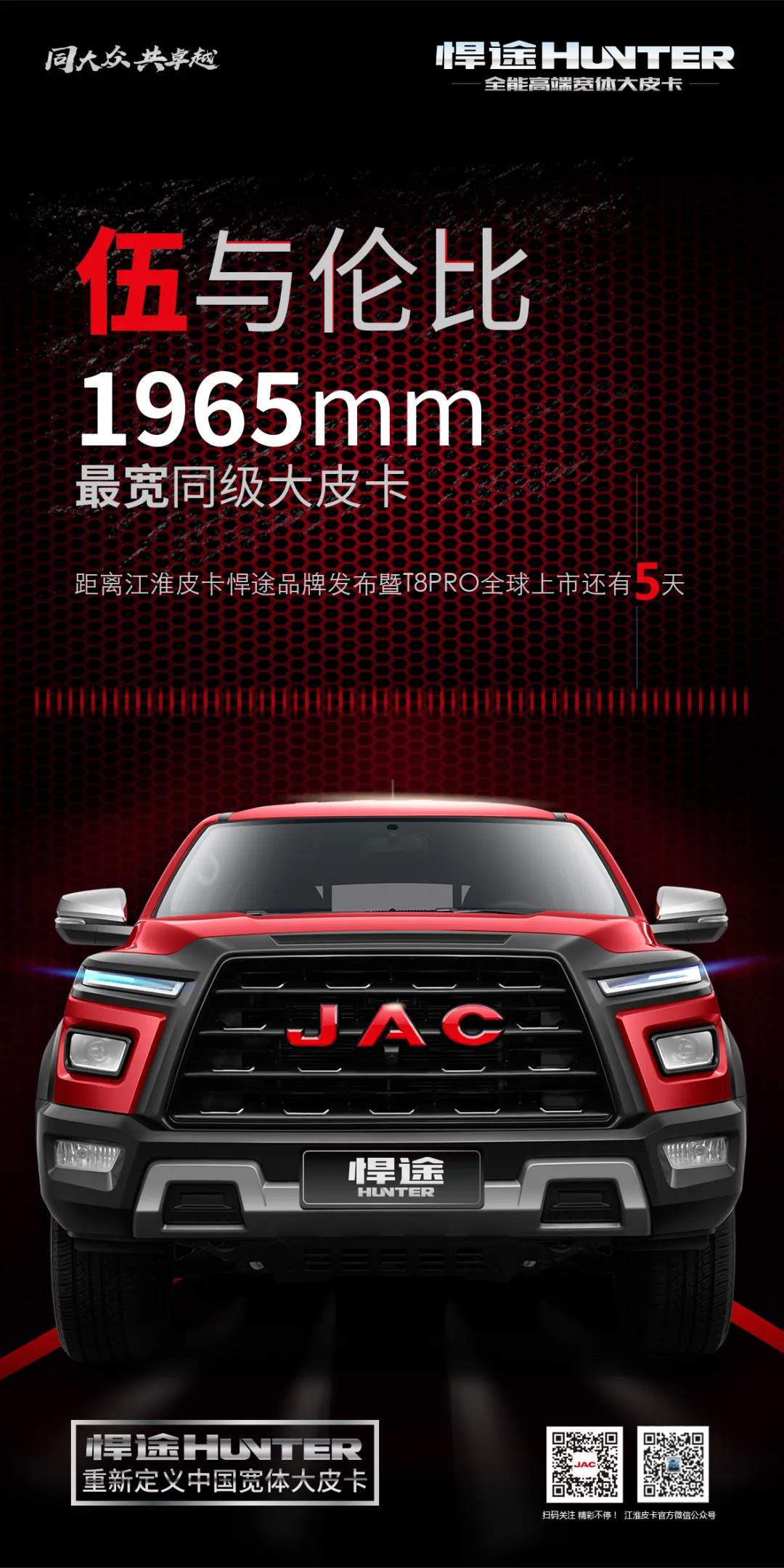 伍与伦比,悍然来袭,江淮皮卡悍途品牌即将发布 编辑张靖 卡车2020年10月21日 10:4910.43W0 江淮皮卡悍途品牌发布暨T8pro全球上市,将于2020年10月25日正式举行! 全新高端宽体大皮卡,悍途HUNTER即将面世! 悍途(5)江淮皮卡(145)江淮轻卡(553)本文来源江淮轻卡,经授权后由编辑张靖发布,观点不代表提加商用车网的立场,转载请联系原作者。编辑张靖提加商用车小编,还请大家多指教!6.22K935.49M39.62W
