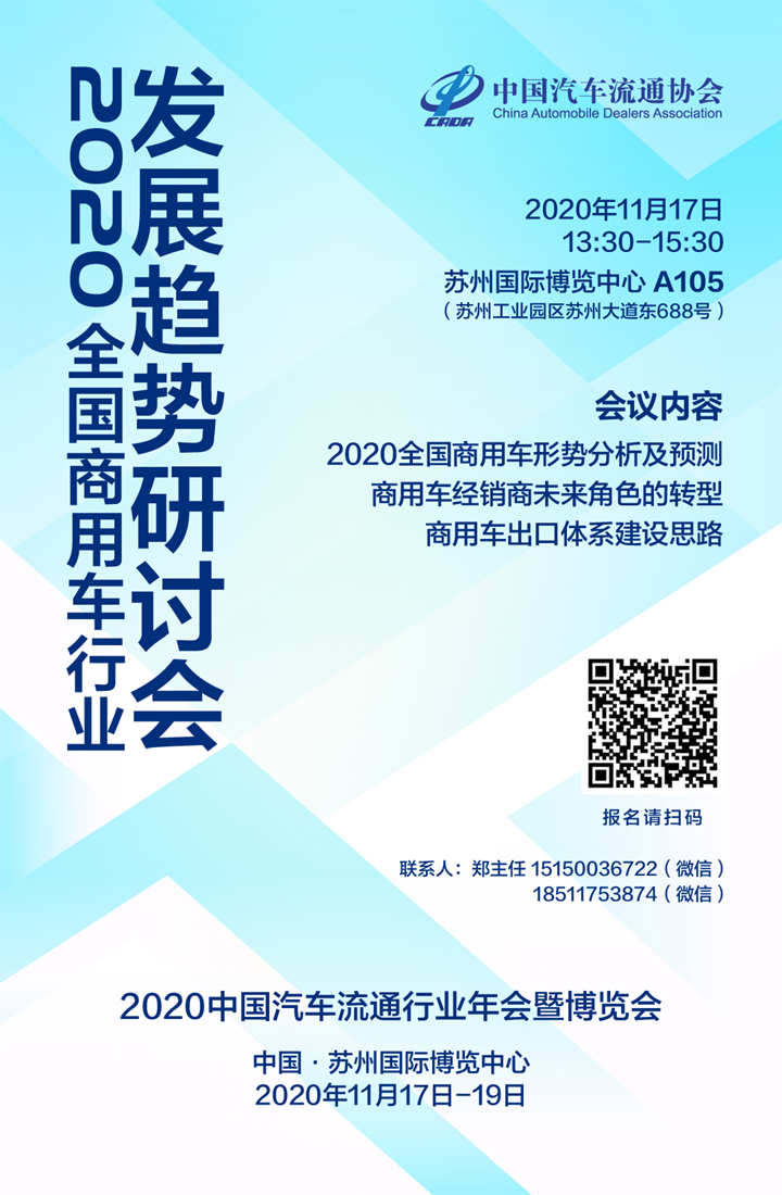 2019中国汽车流通行业年会商用车产业发展研讨会,为此,在2020年11月17-19日由中国汽车流通协会主办的中国汽车流通行业年会暨博览会期间,中国汽车流通协会商用车专业委员会将于11月17日13:30-15:30在苏州国际博览中心A105组织“2020全国商用车行业发展趋势研讨会”,诚邀商用车行业的各位朋友参加。