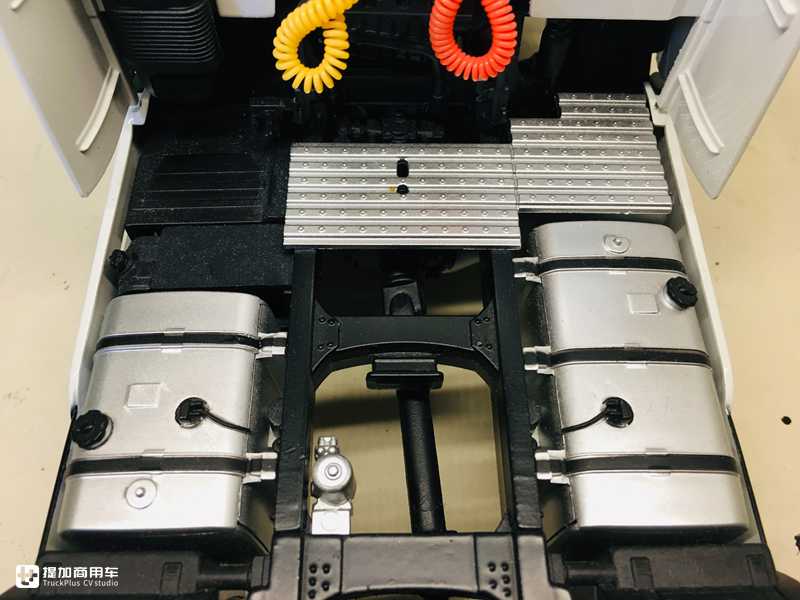 操作平台的面积不算大,分为两个区域,实车上来看这个面积刚好够驾驶员进行相关操作。底盘上两个大油箱容积在实车上可能轻松达到1000升,而油箱的细节也做得不错,一些管线的结构不仅有还原,还进行了分色。