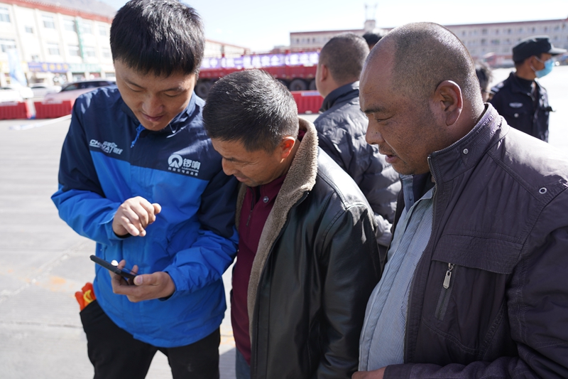 现场有一位卡友,对展区的锣响新国标挂车产生了极大的兴趣,在认真细致地听完负责人的介绍后,还饶有兴致地使用手机APP操控挂车的提升桥。原来,这位卡友是从格尔木运输玻璃来拉萨的,而其使用的半挂正是锣响挂车。
