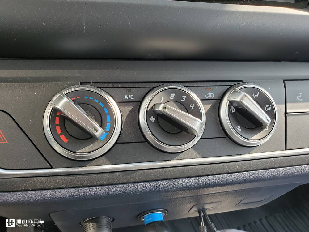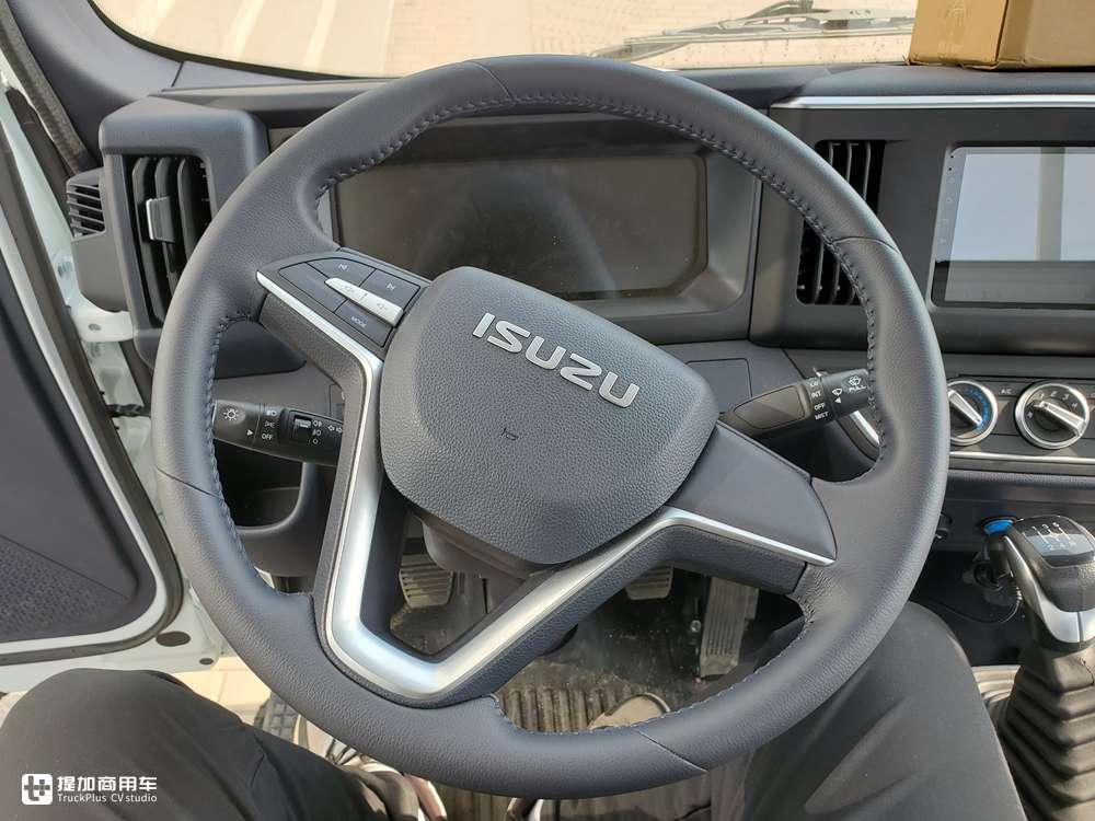 五十铃翼放全系都配备多功能方向盘,方向盘为三幅造型,带有银边饰条,外圈为皮革包裹材质,手感不错的。因为是低配车型,主要定位是城市配送,所以方向盘右侧的定速巡航控制按键没有配备。