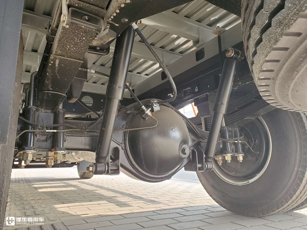后桥配的是一个3.5吨级别的单级减速桥,采用5+5片式的钢板弹簧悬架。车辆为液压制动,所在后桥上是看不到制动气室的,液压制动在制动力矩上要稍逊于气压制动。