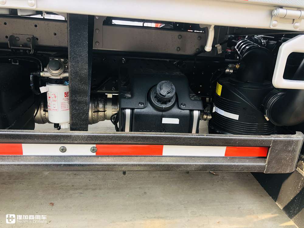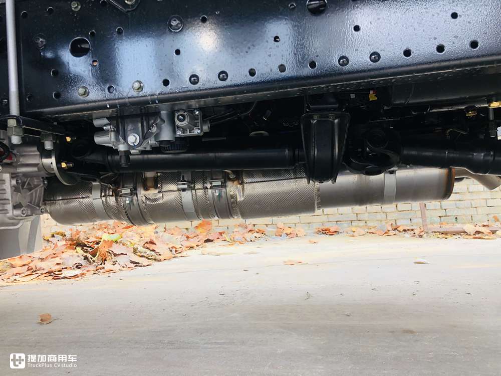 后处理系统安置在底盘侧下方,采用了SCR+DOC+DPF技术路线,环保能力达到国六B阶段标准。
