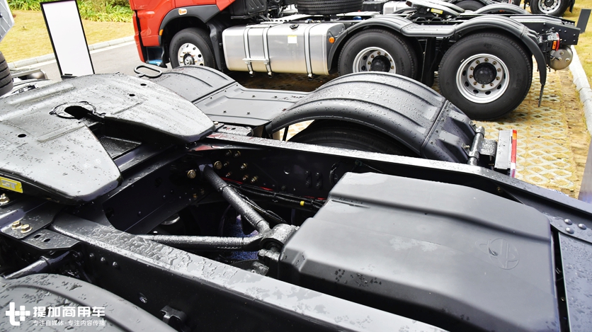 关于轻量化,除了铝合金油箱、铝合金储气筒外,这台H7采用的是2+3形式的钢板簧,在钢板簧的轻量化上已经做到了极致。