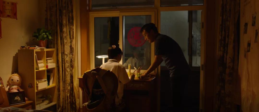 女儿伫立窗前,静静看着爸爸上车、看着车灯照亮前路,直到在黑夜中消失不见。