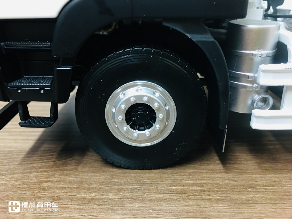 大梁末端两侧布置有上装攀登脚踏,使用合金材质,能够避免在摆放时出现损坏。模型参照的原车后桥,使用了HY485轮减桥,能够很好地在工地与重载运输时候提供强大的轮上动力,驱动车身前进。