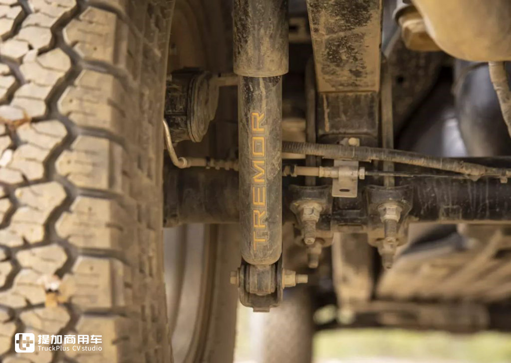 与其他F-150一样,Tremor使用高强度钢框架和高强度军用级铝合金车身。此外,F-150 Tremor具备锁定前后差速器、可选的Torsen限滑前差速器、按需扭矩分动箱、越野辅助、2 kW Pro Power车载发电机等配置。