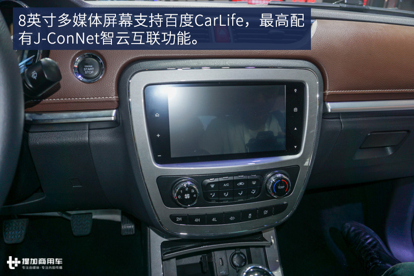 展示车是指导价12.88万元的四驱智联型,全系最高配的车。T型中控台的风格十分简约,棕色的皮革材质提升了视觉效果。中间8英寸多媒体屏幕支持百度CarLife功能,最高配有J-ConNet智云互联功能。