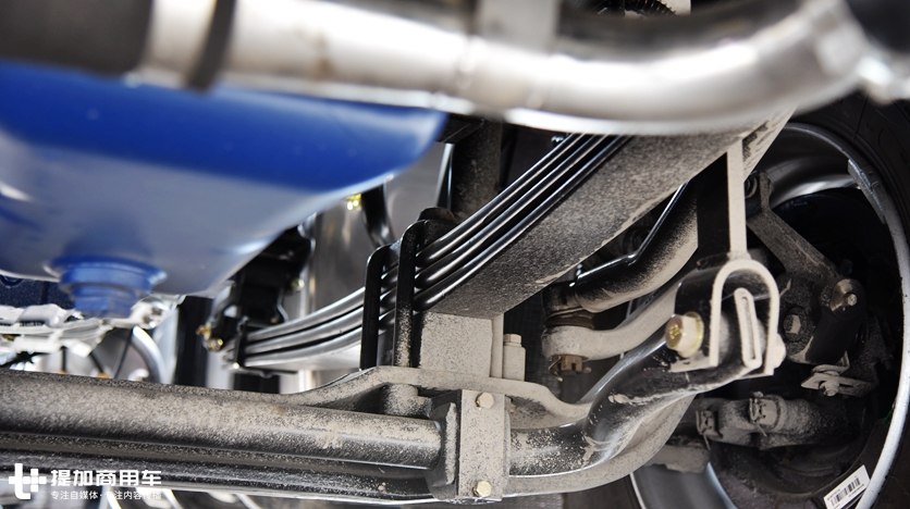 轻量化车身设计也是三一卡车一个亮点,钢板簧采用少片簧设计,前桥三片,后桥四片。而全钢丝子午线轮胎同样能为车身减重不少。