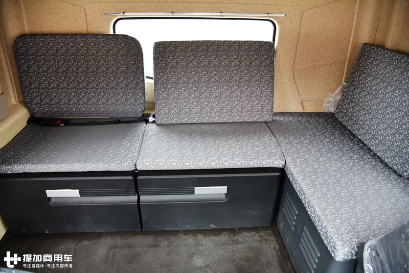 说完极具竞争力的底盘配置,视角可以挪到驾驶室了。惊艳,绝对的颠覆性设计,你能想到一台国产卡车的内部被设计成大沙发吗?当我爬上这台卡车驾驶室时,至少是刷新了我的三观,巨大的纵深空间,以至于可以在驾驶室内搞个聚会了。