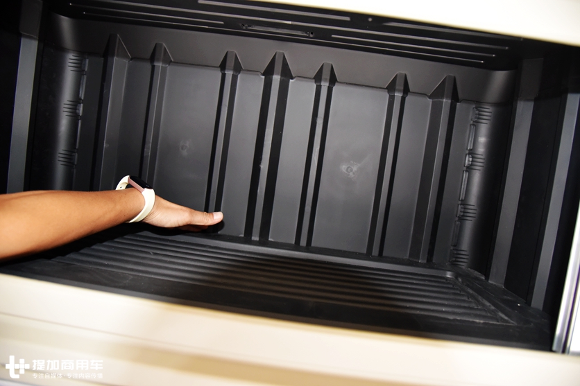 卧铺被设计成拐角沙发的样子,实不实用不知道,但绝对是大空间。卧铺空间并没有被浪费,在卧铺底部有两个抽屉式储物箱,拉开后可以完整的把一台微波炉放进去,如果需要,定制化车载冰箱应该可以选配。