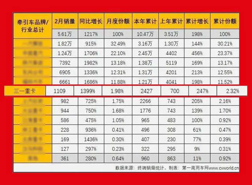 根据第一商用车网最新出炉的2月份牵引车终端销量数据显示,国内牵引车销售达5.61万辆(不含出口和军品),环比增长15%。与去年同期相比,2月份主流牵引车企业在终端市场的表现全数实现大增,但仅有6家企业增幅超过1000%,三一重卡位列其中!三一重卡今年2月单月销量同比去年增长14倍,前两月加总销量同比去年涨幅达2.5倍!