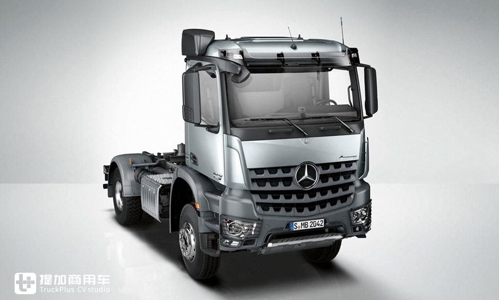 用于对比的奔驰Arocs官图。可以看出,更换前面罩后,整车的外观便和Arocs拉开了不同。但由于模具原因,原有的在雨刮器下方放置奔驰小LOGO的凹陷并没有取消。