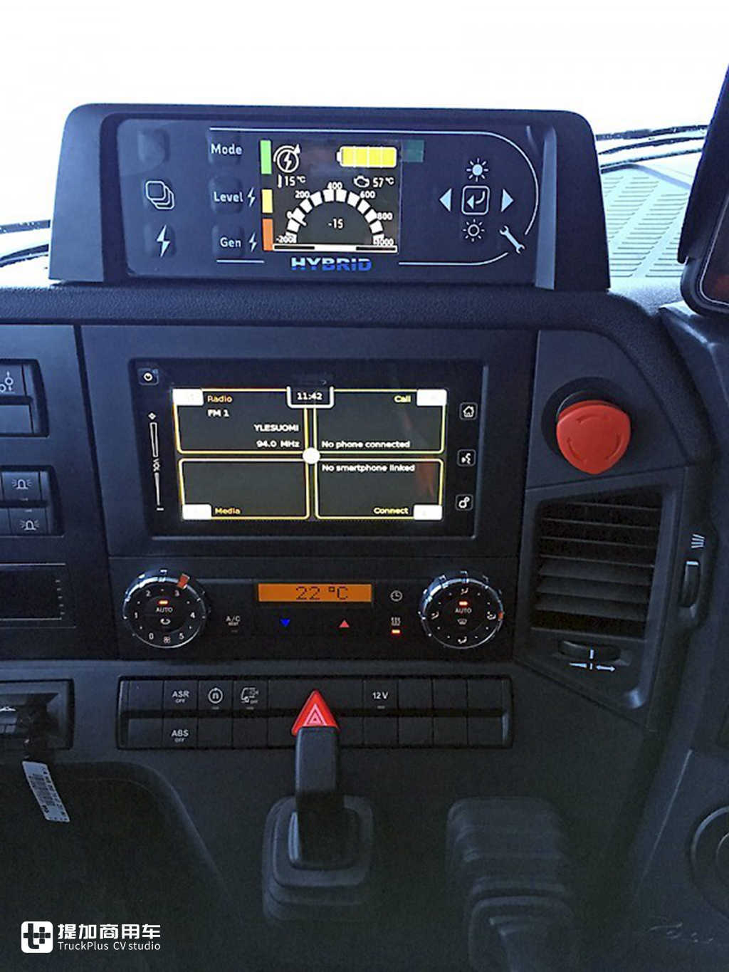 驾驶室内部,与奔驰第四代Actros与Arocs卡车差别不大,方向盘中间的奔驰LOGO换成了西苏LOGO,多媒体屏幕上方加入了一块数据屏幕,监控混动系统的工作状态。红色的按钮为急停按钮。紧急情况下拍下该按钮,电力系统便会断开离线。