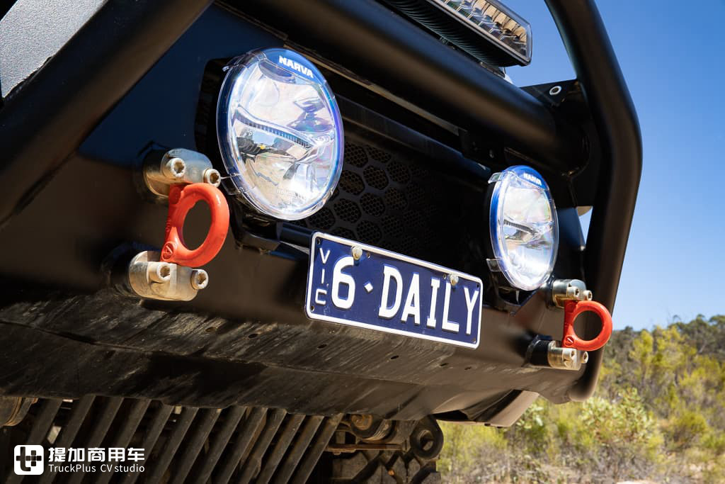 在原车保险杠的基础上,依维柯加入了更加粗壮的钢制保险杠,并在上方安装了LED射灯及探照灯。这种配置不仅能在野外提供更好的照明表现,也能尽可能防止车辆损坏。附加的红色拖车钩也固定在保险杠上,采用螺栓直接固定,简单粗暴且好用。