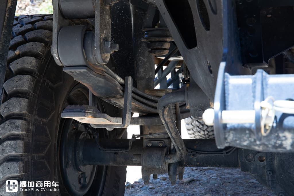 车辆全车采用了板簧悬挂,前轴后轴都带有差速锁和稳定杆。刹车配置则选用了前盘后鼓的配置。这个配置已经够用,但拥有更好的刹车性能总不是坏事,依维柯也并不提供选装后桥盘刹。