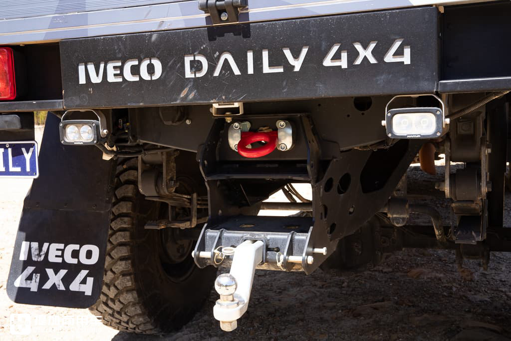 车尾安装有拖车钩以及拖车方口,此时拖车方口被转接成了球头。除此之外还安装了LED等以及镂空的依维柯Daily 4x4产品标识。离去角方面,这台车达到了39度。