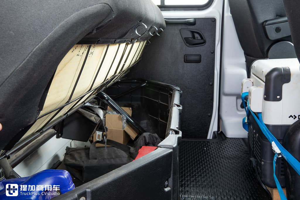 后排布置采用了四联大通座。受制于驾驶室尺寸,后座的靠背角度等均不可调,腿部空间也略微逊色。