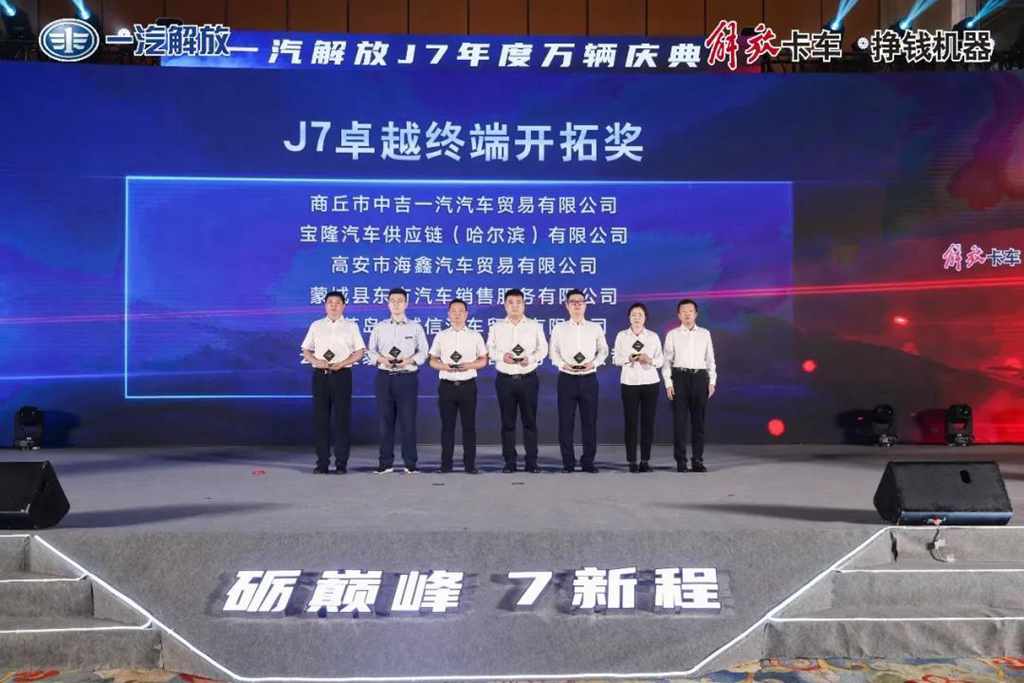 仪式现场,一汽解放汽车有限公司产品管理部部长彭龙为表现突出的经销商颁发J7卓越终端开拓奖;一汽解放总经理助理、销售公司总经理、党委书记王志才为在J7销量取得突出贡献的经销商颁发J7功勋销量贡献奖。相信在未来的道路上,解放将与经销商伙伴深化互信互惠,携手开创下一段巅峰历程。