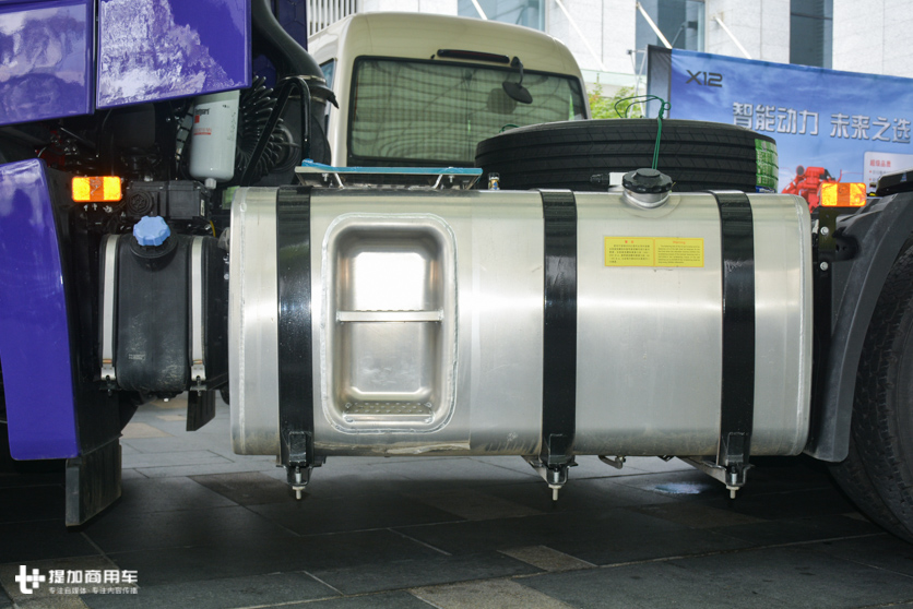 快运定制车型底盘上与普通车型还有一点有所区别,那就是油箱。主副双油箱设计,容积700+500升,总计1200升,最少3000公里以内没有续航的焦虑,过了3000公里再找加油站都很从容。