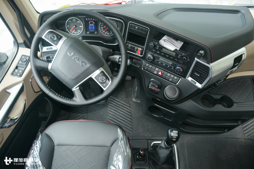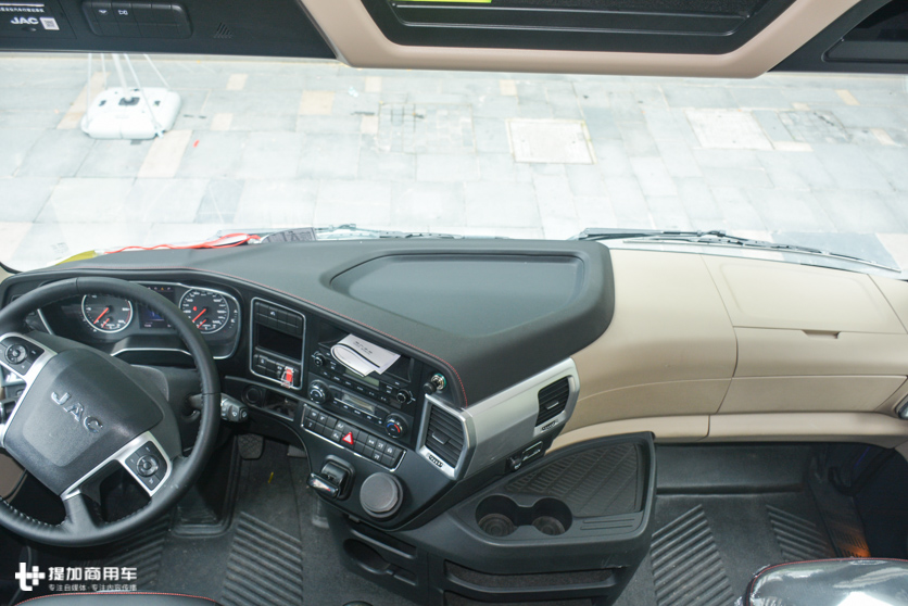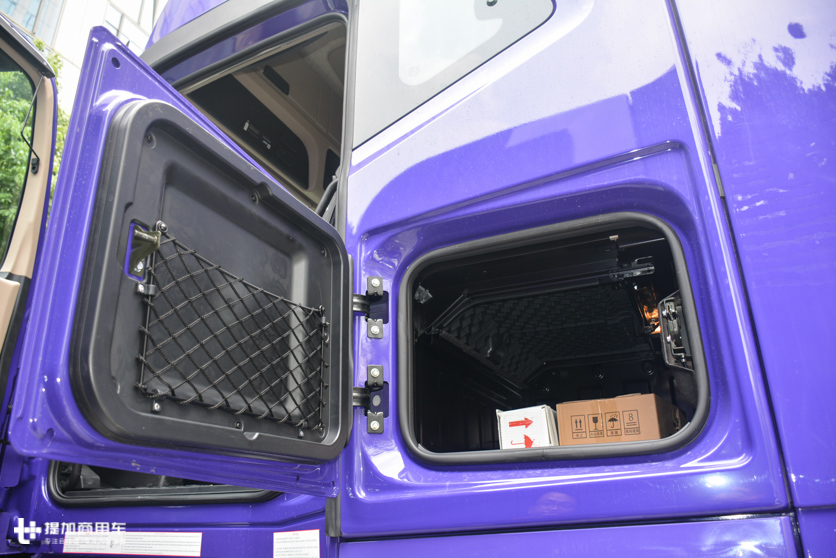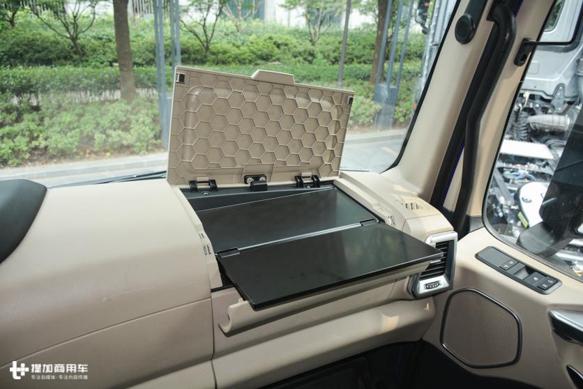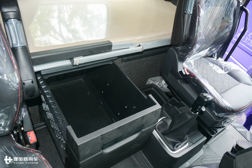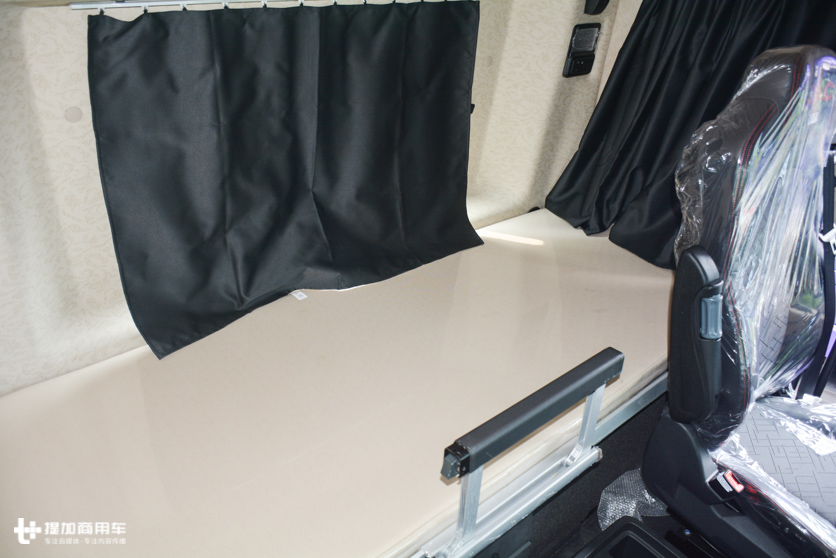 进出驾驶室需要踏4级上车踏板,好在踏板逐级错落布置,上下车不至于别扭,为了平地板的宽敞空间,多走两步阶梯是值得的,进到车里可以随意走动的空间感让你再也回不去原来局促的非平地板驾驶室,在非平地板驾驶室里面,我们只能挪来挪去,无法直立行走。