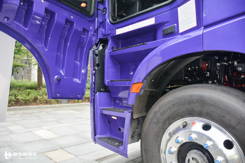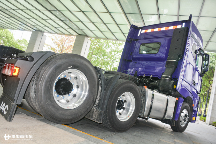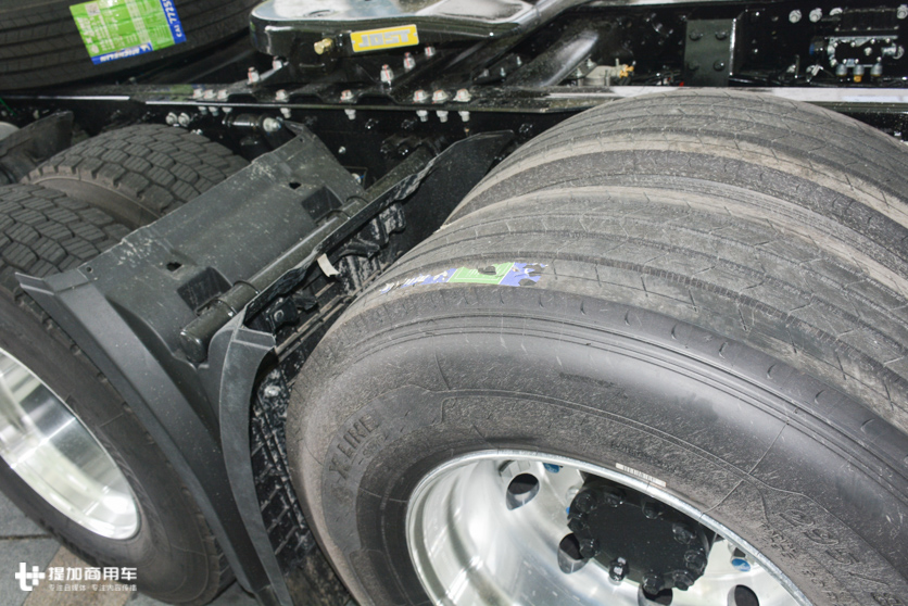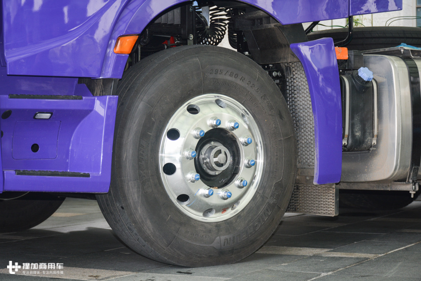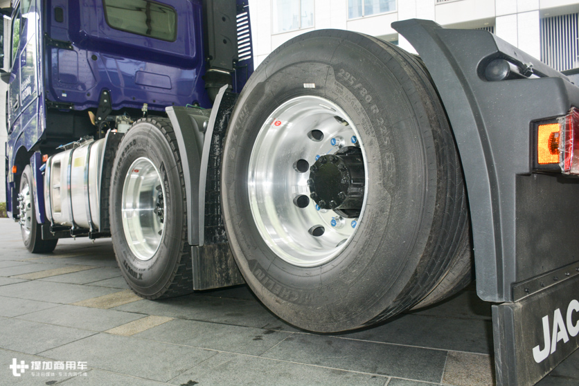 轮胎的选择也比较讲究,全车铝合金轮降低自重,米其林的295/80R22.5轮胎,针对驱动轮和非驱动轮花纹做了区分,不再和以前一样图省事,全轮位都用一种花纹。