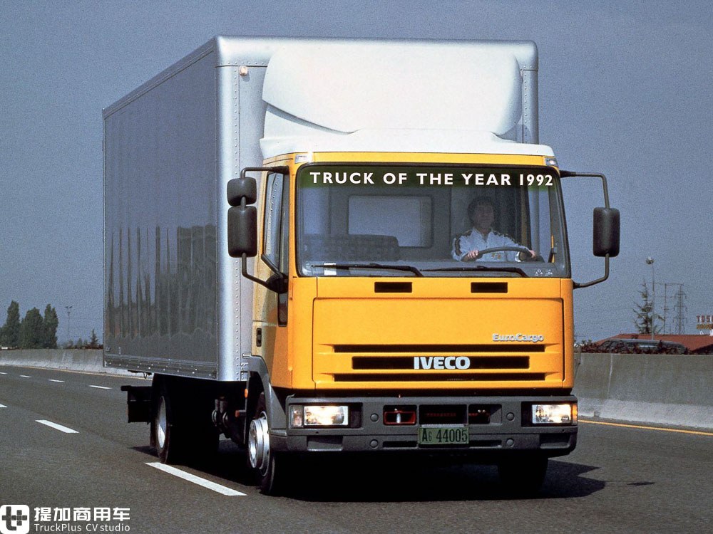 就是它:1992年年度欧洲卡车,依维柯EuroCargo。它的外观由大师Giorgetto Giugiaro设计,一眼并看不出和福特Cargo之间的关联。但不管是从车型名称,还是驾驶室框架来说,处处都透露着福特的味道。