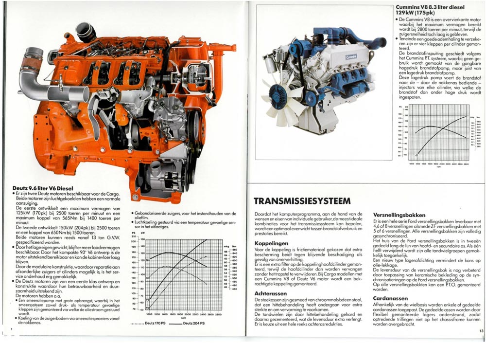 最初,福特仅提供GVW范围为6至28.5吨的Cargo系列车型,对于长途干线运输来说,这个GVW属实不够。直到1982年秋季,GVW为32吨的Cargo增强版车型才珊珊而至。在动力方面,福特Cargo有多种发动机可选。继承自D系列卡车的Dorset系列四缸、六缸柴油机,福特新开发的发动机都可供选择。对于GVW在8吨以下的卡车来说,仅能选择120匹马力的发动机。而GVW在8到15吨之间的卡车则能够选装最高150匹马力的发动机。在GVW更大的卡车上,可选的发动机就更多了。例如风冷的道依茨V6、康明斯、Perkins V8都能选择。