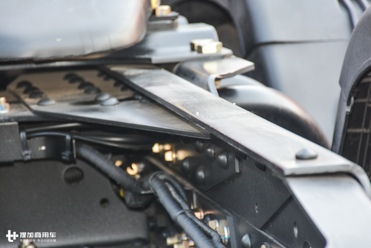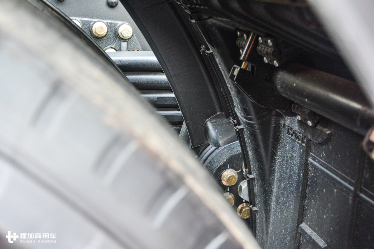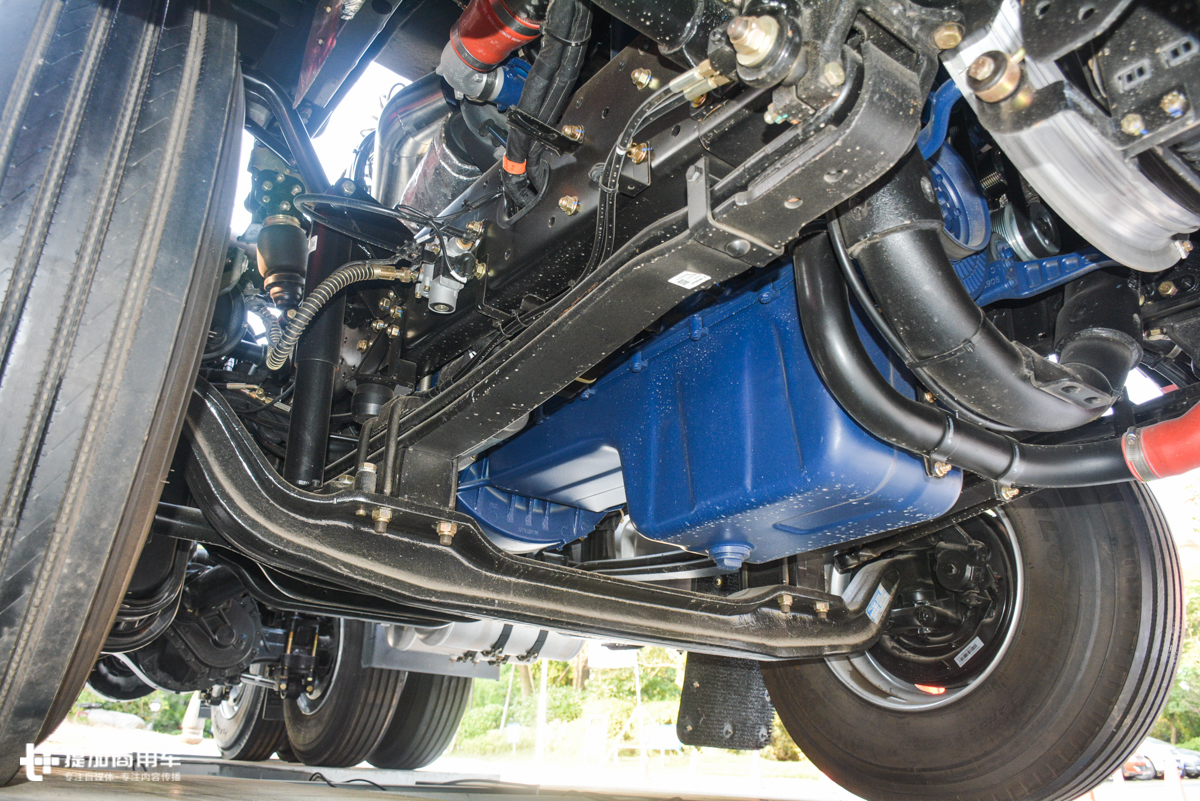 底盘轻量化方面使用单层高强度钢车架,5.5吨前桥和11.5吨后桥,小吨位车桥的自重相对来说要轻一点,标载运输业也够用。