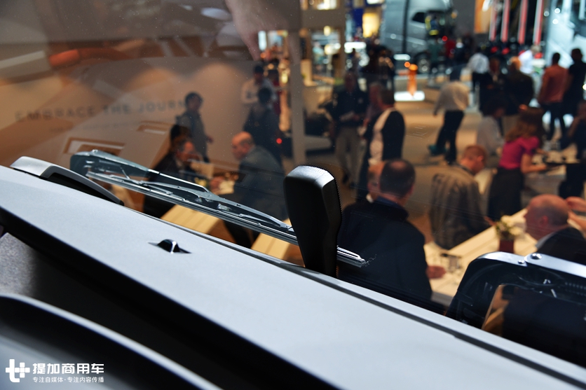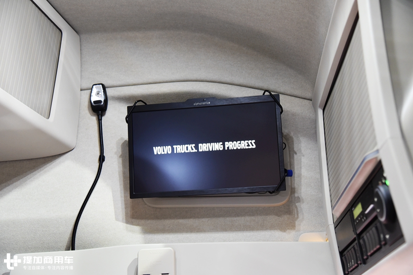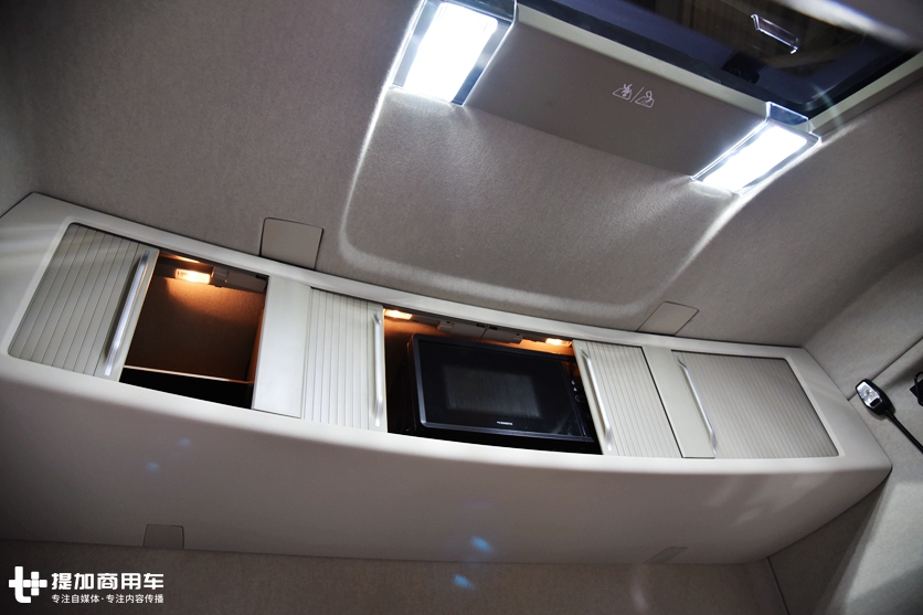作为纪念版,驾驶室内部设计肯定会有区别。在驾驶位一侧头顶,安装有一个卫星电视,这是一个特别之处。其次在本该属于上卧铺的位置,设计成三个大的储物箱,而且在储物箱内放置了微波炉,这种配置很欧洲,因为在欧洲行驶的卡车多数是一个驾驶员,所以多一些生活用品很有必要。