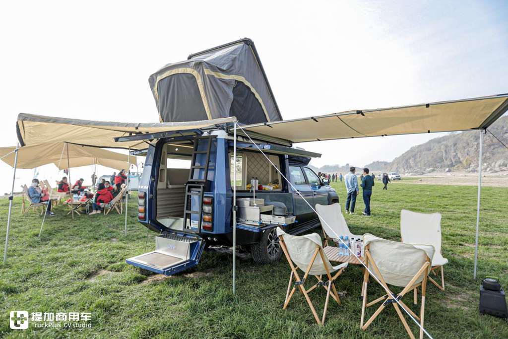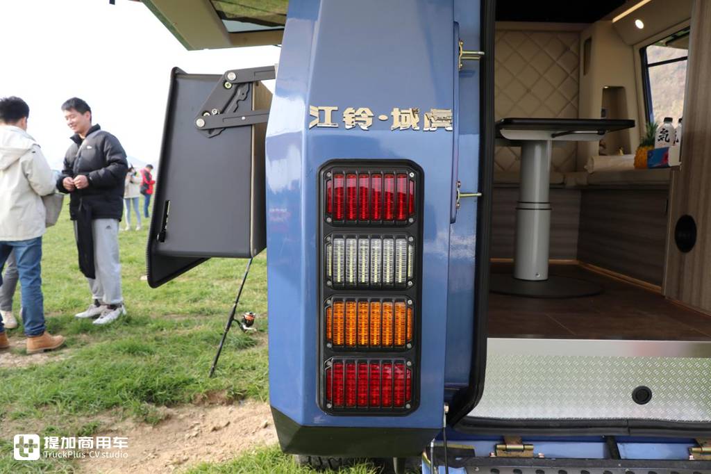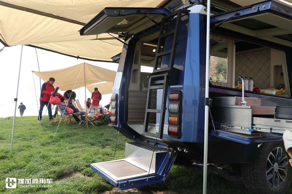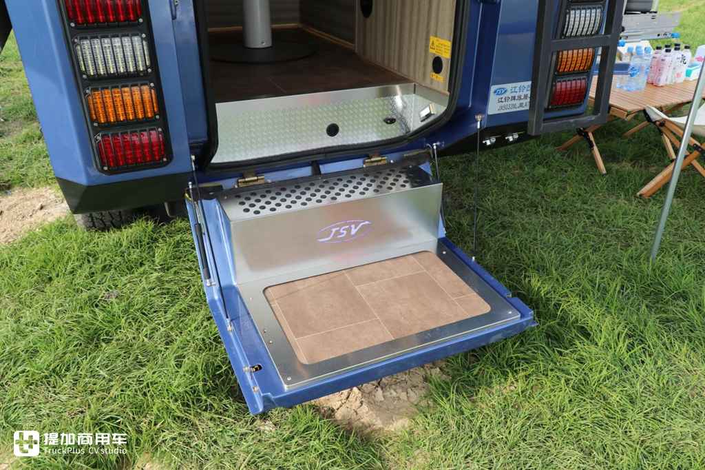 后方尾门采用了对开式的打开方式,下半部分打开之后会变成一个可供上下车的脚踏,瓷砖面+迎宾灯的组合美观耐看,无需用户后期改装。在尾部一侧还带有双阶爬梯,通过该处爬梯可行至上方帐篷内进行休息。