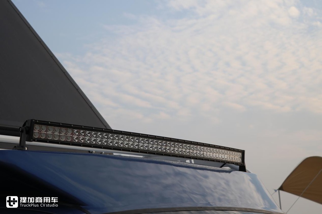 车顶的探照灯为LED光源,具有超强的照明效果,还可以调节不同亮度,并且其特性优势还非常的节能,除了行车之外,露营时也可以充当一个照明的主力使用。