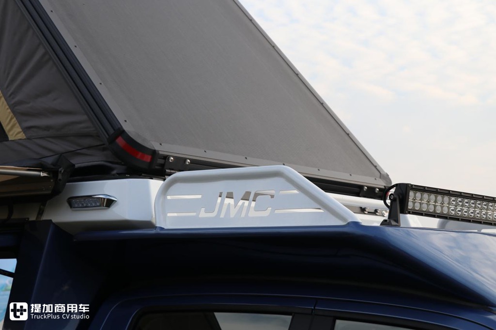 考虑到后斗改装,可能置物空间会变少,针对大件行李江铃域虎7钓鱼版车型在车顶上设置了原厂的行李架,带车标镂空和可捆绑设计,放上大件行李之后能进行一个很好的固定作用。