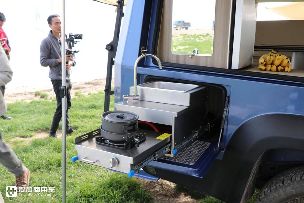 车斗侧面单独的开槽可谓是妙笔生花,直接在槽内配备了抽拉式的迷你厨房,这样的话露营饮食就得到了解决,集涮洗与灶台一体的设计能让用户就地体验到最新鲜的食材和最熟悉的烹饪,大大增加了野营的乐趣。