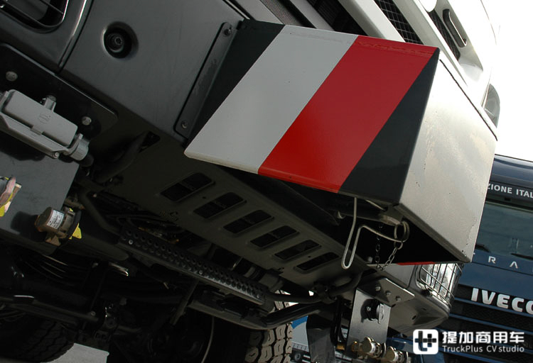 仅是从挡泥板和车轮之间的空隙,您就能直观的感受到车辆的离地高度了。高高的悬挂将车辆大梁托离地面,因此便形成了这种有趣的效果。在车辆的右侧底盘侧面,布置了更多的银色刹车储气罐,也安装了本车的尿素液罐。