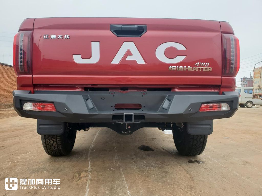 后部保险杠采用钢制材料,带有原厂“流氓钩”插销,便于拖挂小型房车或板车。江淮悍途的尾灯设计为“1”字形,垂直贯穿上下,与前面的横向大灯对比,并且光源方面也是使用的LED光源。