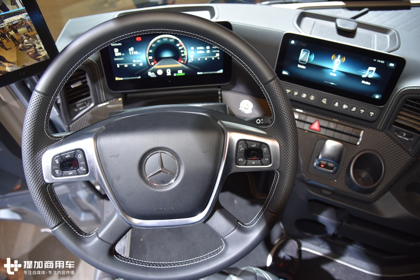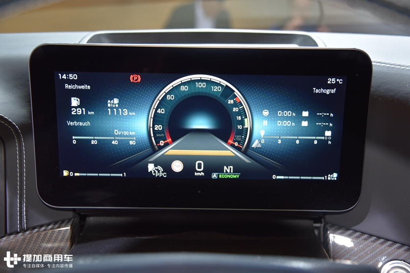 仪表盘被以整块液晶屏替代,全部改为数显模式。除正中间的速度显示外,液晶屏还融入更多车辆状态信息,比如燃油还有多少,尿素还有多少,预计还可以行使多少公里等等。车辆信息全部数显化,可以说是革命性的改变,驾驶员能很直观地了解相关信息,而不用去靠猜,靠推测。