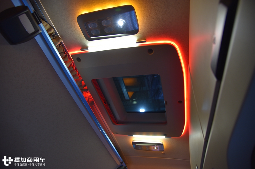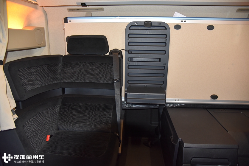 阿克托斯Edition在保留卧铺的同时, 居然集成了一张沙发座椅,座椅平时在副驾驶位置,当需要更大空间时,把下卧铺掀起来竖直,座椅拉倒最后面,就是一张舒服的沙发了。这个设计真的很赞,既满足了舒适的驾乘空间,又兼顾了驾驶室内功能多样化。