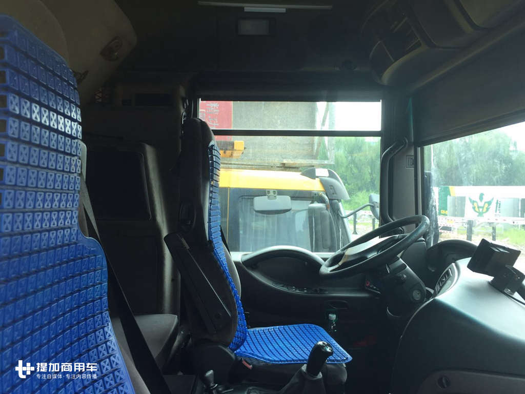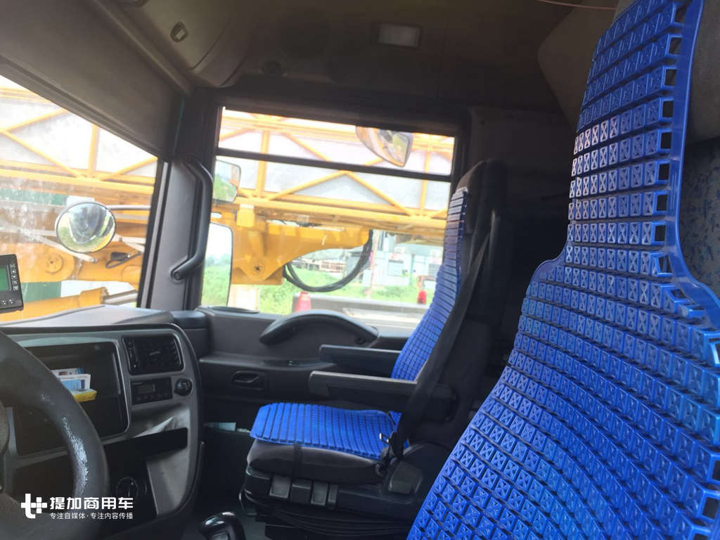 驾驶室操控台为“海湾”式风格,这也是国内外卡车操控台经常采用的一种风格,给予驾驶员更好的操控性。手自一体变速器的换挡杆与手动变速器几乎一致,只是在档杆的顶部没有档位数字,而是加号和减号。这款ZF手自一体变速器已经革新为ASTRONIC,也是目前国内外卡车企业很多采用的一款变速器。挡风玻璃前还有一个整体式样的遮阳帘,驾乘人员可根据个人需要做适当调整。从主驾驶座位后面不难发现此车为双层卧铺配置,折叠的上层卧铺还有储物的网兜,下层卧铺底部还有较大的储物格,更好方便长途驾驶员的生活需求。这是一辆年代久远的老车,但点滴细节之处却透露着人性化,同时更希望将驾乘人员的安全放在首位。