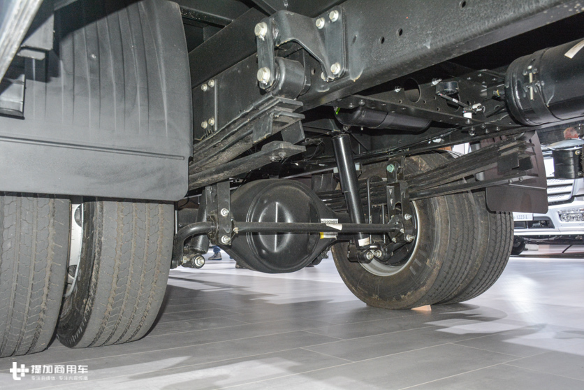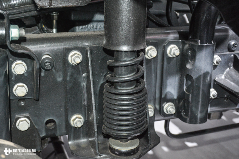 动力和底盘配置都不具备很强的超载能力,乖乖的标载运输就行了。前后都是少片簧的钢板悬架,前悬架3片,后悬架3+1片。