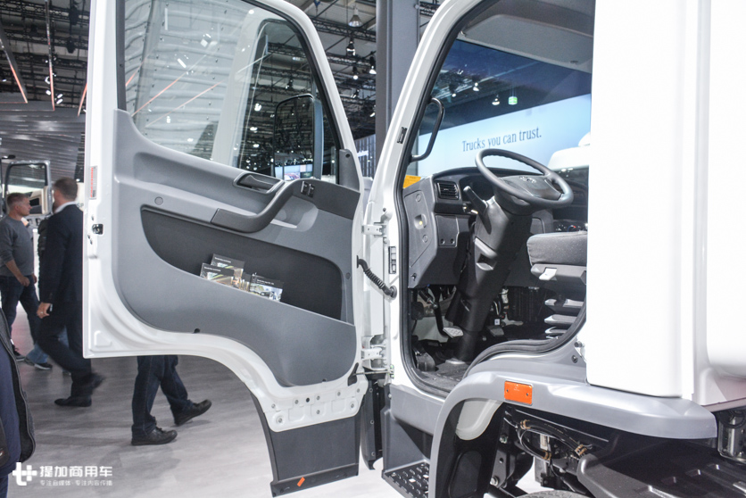 上车到不麻烦,就一级踏板。左右车门都是电动升降玻璃,升降开关的位置比较特殊,布置在侧面。这样的设计风格可以追溯到上个世纪了,国内最近也就是德龙F2000和F3000用过, Accelo这款驾驶室的模具也是有年头了。