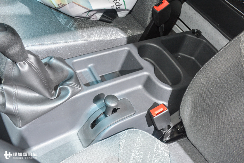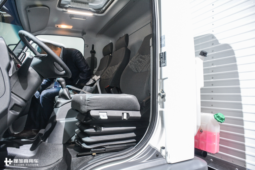 驾驶室内部宽度只有1600mm,高度1350mm,对于空间不要有太多的期待,横向并排布置了3个座椅就没有多余的位置。3个座椅都是全尺寸,不像国产车中间座椅又小又窄,靠背只有半截。