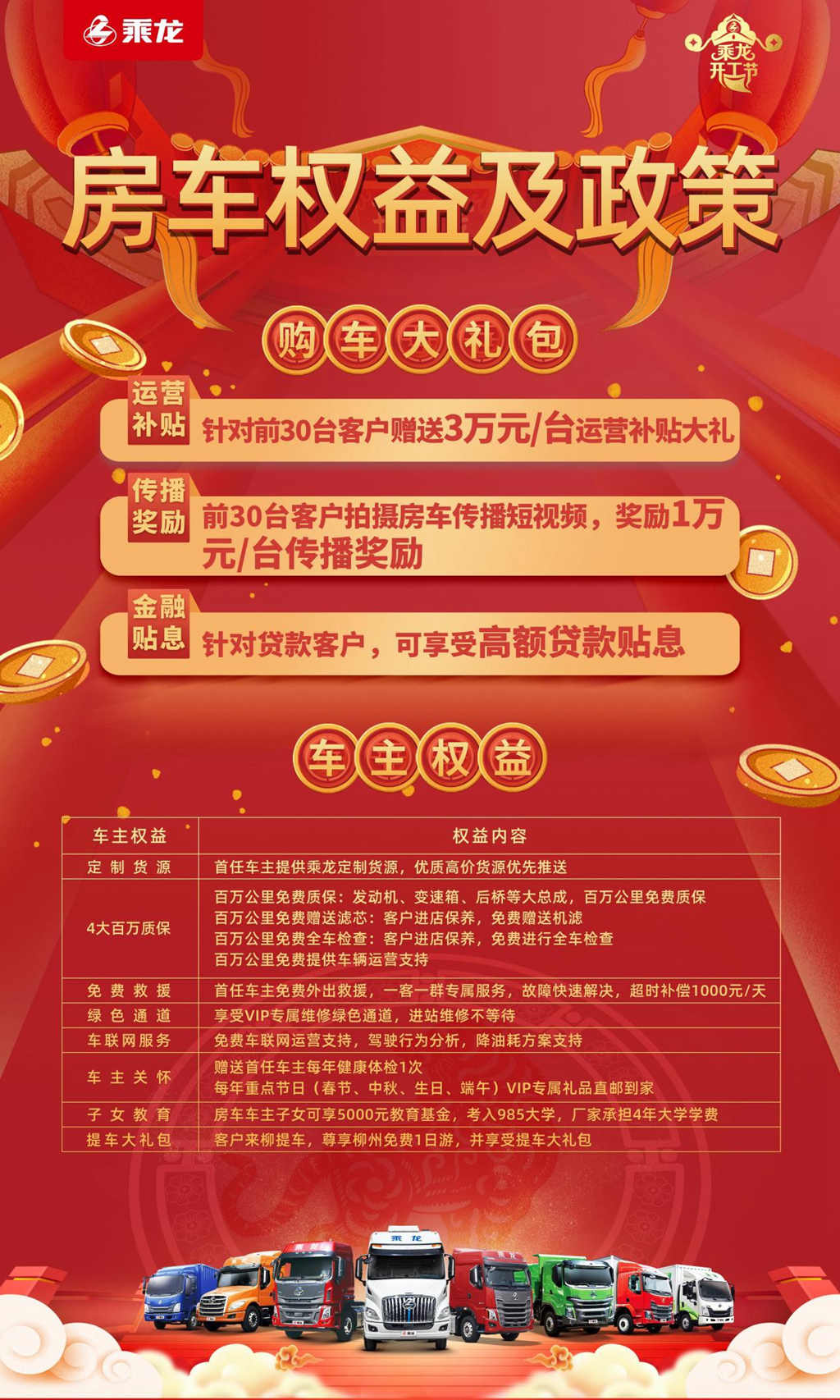 一切以客户为中心,是乘龙一直以来不变的初心。在这个最有爱的日子里,乘龙以2022款产品上市、乘龙在线服务品牌发布、国六中国行启程、乘龙T7房车抢购,为卡友点燃新年开工创富征程。开乘龙,财运红!在未来的征途中,乘龙将为广大卡友提供更多创富车型和超值服务,和千万卡友一起创富赢未来!