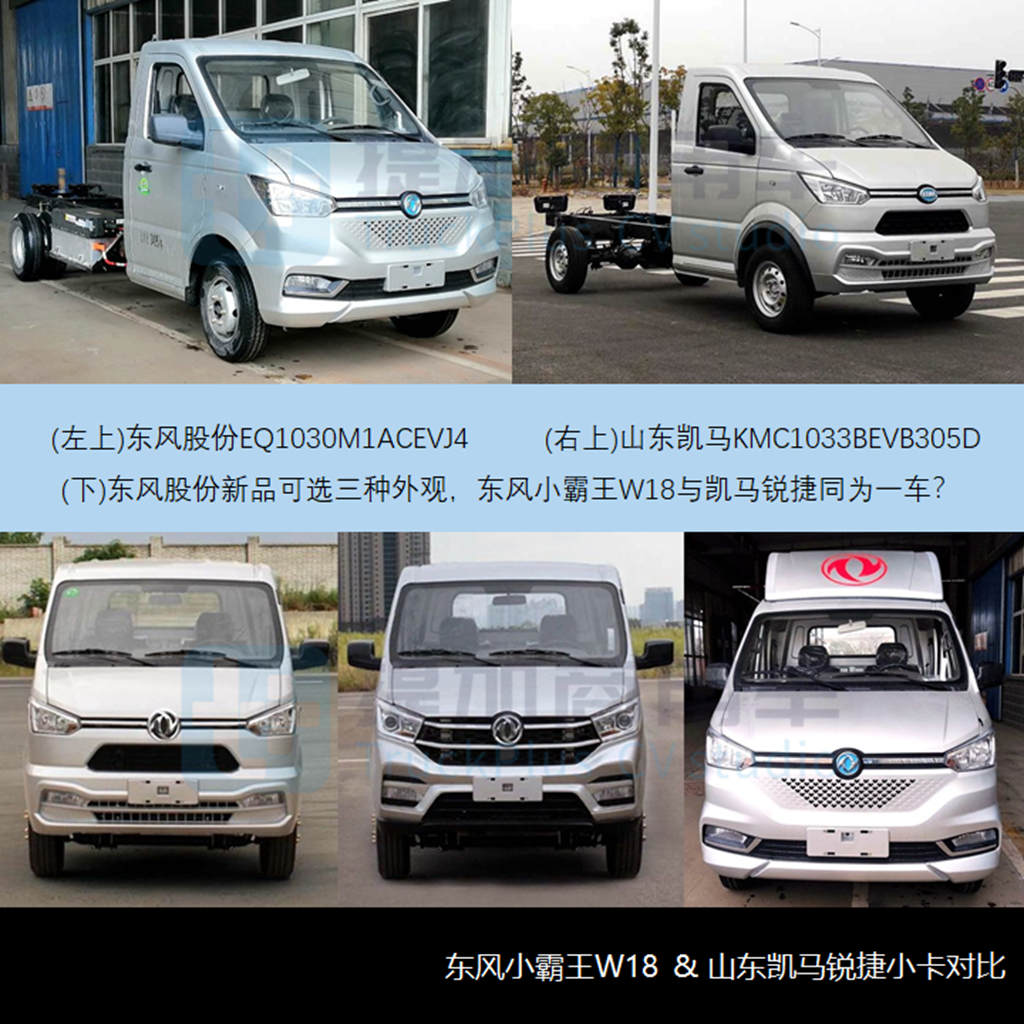本批,东风股份DFAC申报了EQ1030M1ACEVJ3/4两款纯电动载货汽车底盘,分别搭载宁德时代/亿纬湖北LFP动力电池,苏州汇川70kW驱动系统。通过观察公告选装图片可知,该系列“尖头小卡”与同期申报的山东凯马锐捷系列KMC1033BEVB305D如出一辙,即有完全相同的外观造型,也有保留驾驶室钣金件主体、对前中网和前保险杠进行微调的造型,更是可选东风小霸王W18系列的外观。山东凯马2008年4月成为中国恒天集团控股单位,同时东风股份也注资3800万元、获得约10%股份,成为参股单位之一,因此东风股份同时享用凯马的产品资源亦属“内部调剂”。由此可做如下推论:东风小霸王W18与凯马锐捷应为“双生花”作品,即一套模具、多家使用的“(准)公模车型”,有实力的车企还可做外观上的“微创手术”、形成新款外观,但内里仍属“换汤不换药”。鉴于凯马已在江西赣州工厂重金投入锐捷系列产线,并作为新一代LCV平台产品全力主推,目前这种通过业内多家配套、共同摊销前期成本亦是出路之一。