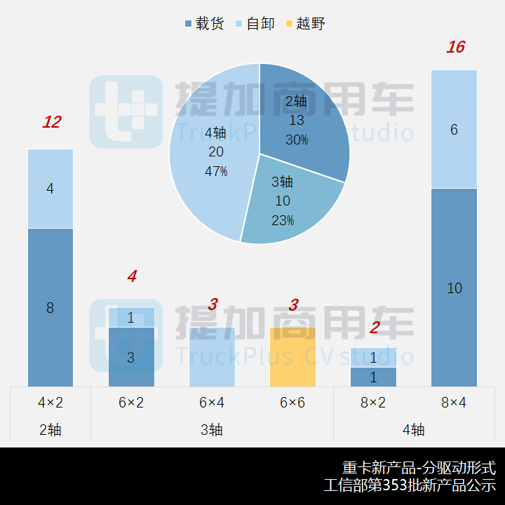 - 四轴新品的强势促成8×4以16款居首,4×2的两轴新品也以12款名列前茅,是本批数量最多的驱动形式。