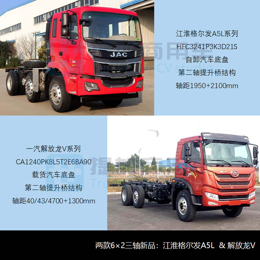 - 一汽解放申报了龙V系列CA1240PK8L5T2E6BA90载货汽车底盘,同为第二轴提升桥结构,但与贯通桥更为接近、第二轴临近第三轴驱动桥,轴距4000/4300/4700+1300mm,搭载玉柴5.1L、240马力柴油机,最高车速89km/h,整体结构与常规“大三轴”更为接近。