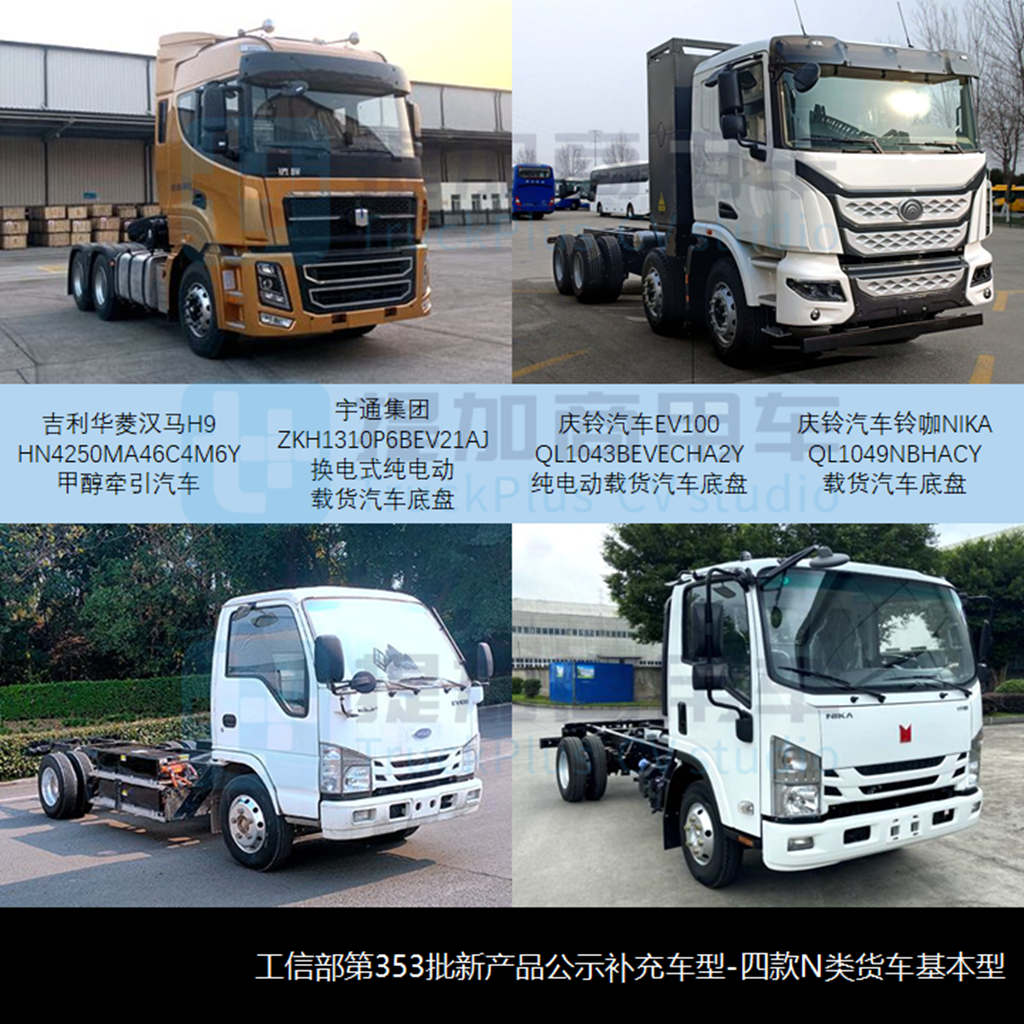 - N类货车包括四款补充车型:吉利华菱汉马H9系列HN4250MA46C4M6Y甲醇牵引汽车,与此前的山西新能源JHC4251GM6属“双生车型”;宇通集团ZKH1310P6BEV21AJ换电式纯电动载货汽车底盘,搭载宁德时代LFP动力电池和宇通客车380kW驱动系统;庆铃汽车EV100系列QL1043BEVECHA2Y纯电动载货汽车底盘,搭载宁德时代LFP动力电池和上海电驱动110kW驱动系统;庆铃汽车铃咖NIKA系列QL1049NBHACY载货汽车底盘,搭载云内动力2.5L、150/160马力柴油机。