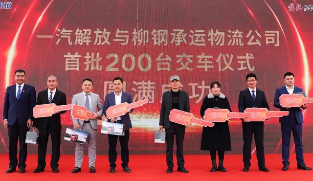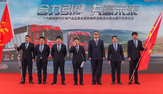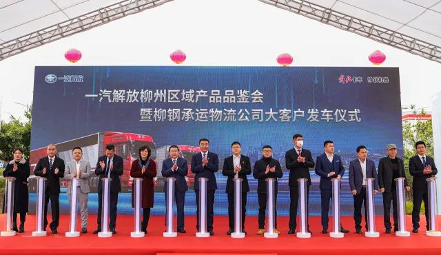 携手并肩齐奋进,凝心聚力踏新程。一汽解放汽车销售有限公司总经理、党委副书记张松、广西柳钢物流有限责任公司总经理周骅、一汽解放汽车有限公司柳州分公司党委书记总经理任典生、广西自治区工信厅汽车处副处长张坤、柳州市柳东新区管委会副主任林艳、广西解放汽车贸易有限公司总经理陈文波以及大客户代表共同启动车辆引擎,预示着一汽解放和柳钢承运物流公司的合作发展即将开启新篇章,驶向新征程。