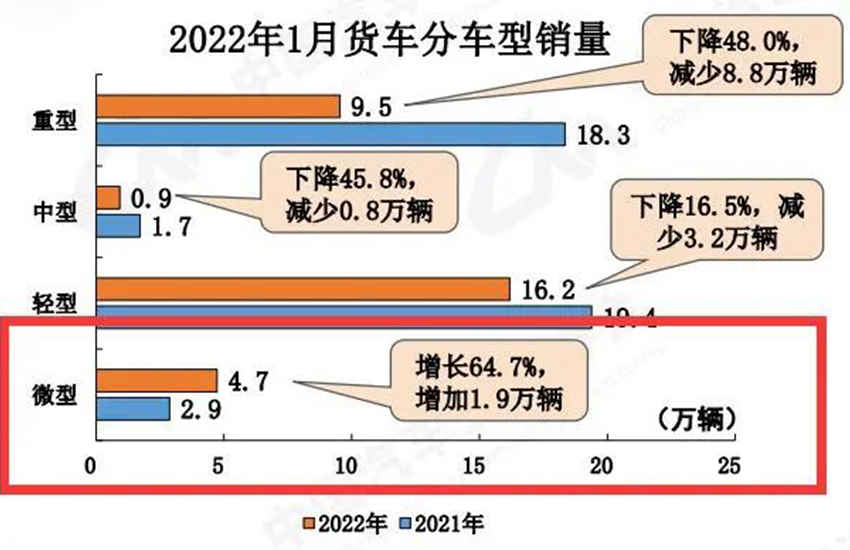据中汽协数据显示,2022年1月中卡销售仅0.9万辆,同比大降45.8%,近乎“腰斩”。